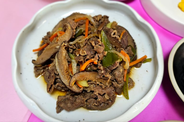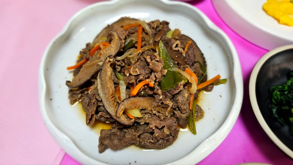 Experience making a representative guest meal with Bulgogi and Japchae served with rice, soybean paste soup, and seasonal side dishes.